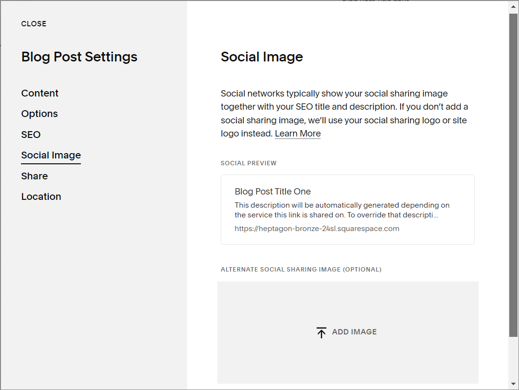 Now you’ll have the Squarespace Blog Post Settings with 6 different sections: Content, Options, SEO, Social Image, Share and Location.