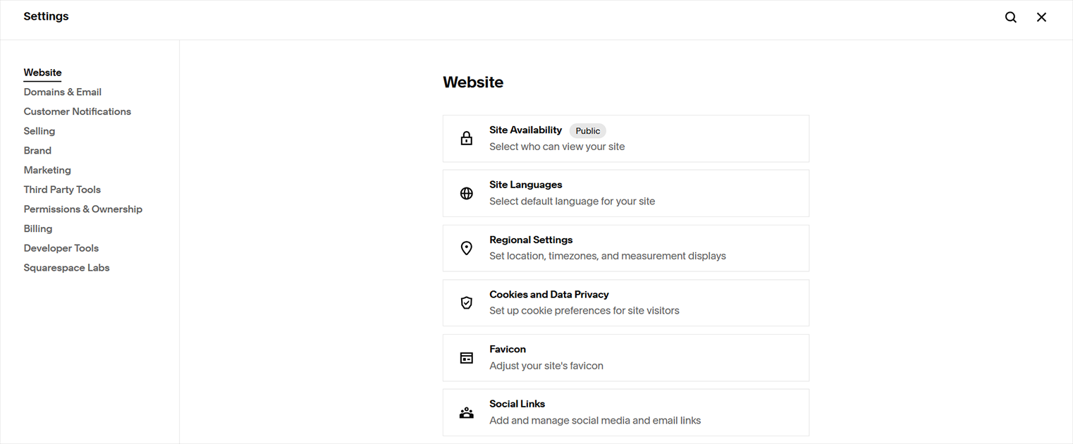 The Website menu contains setting options for your Site Availability, Favicon (or browser icon), Social Links as well as your Cookie Banner.